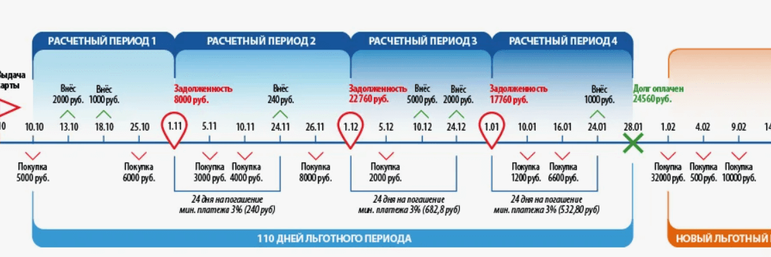 Если вы начнете разбираться в схеме льготного периода (а это сделать нужно), столкнетесь с такими понятиями как расчетный период и платежный период. Объясним что это такое схематично: